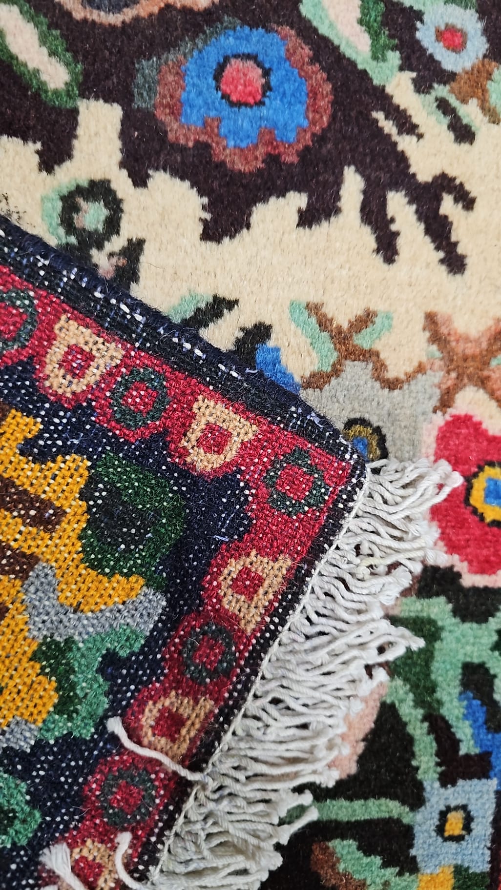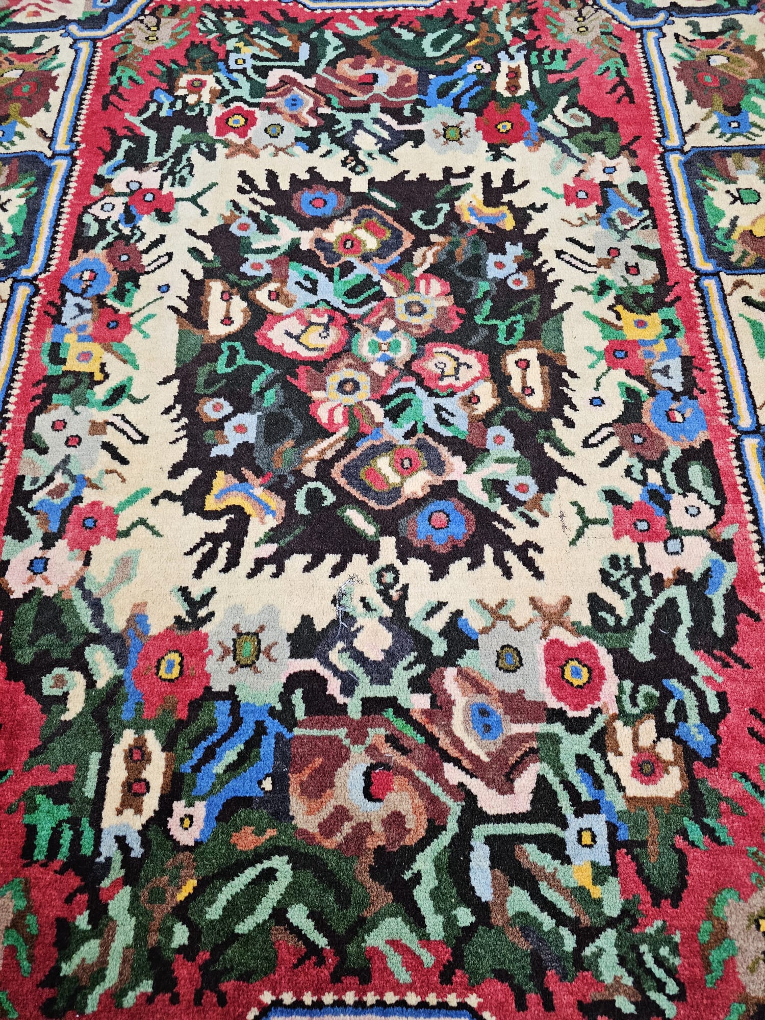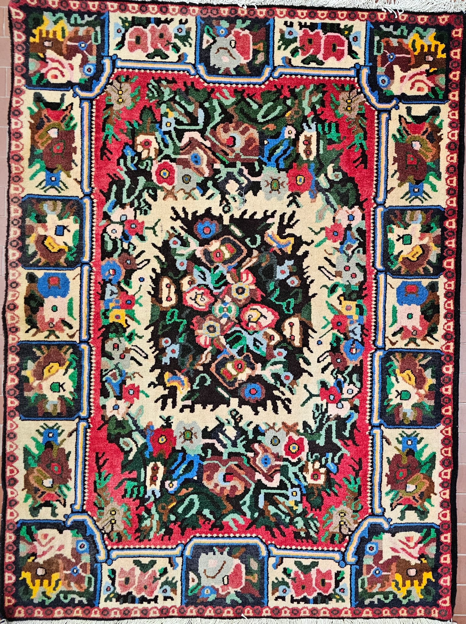 Tappeto Persiano mai calpestato, in ottimo stato di conservazione, vello in pregiata lana su cotone, anni 1980 c.a. cm 156×118, manifattura di Bakhtiari, disegno floreale con il motivo del giardino di rose, nodo finissimo.